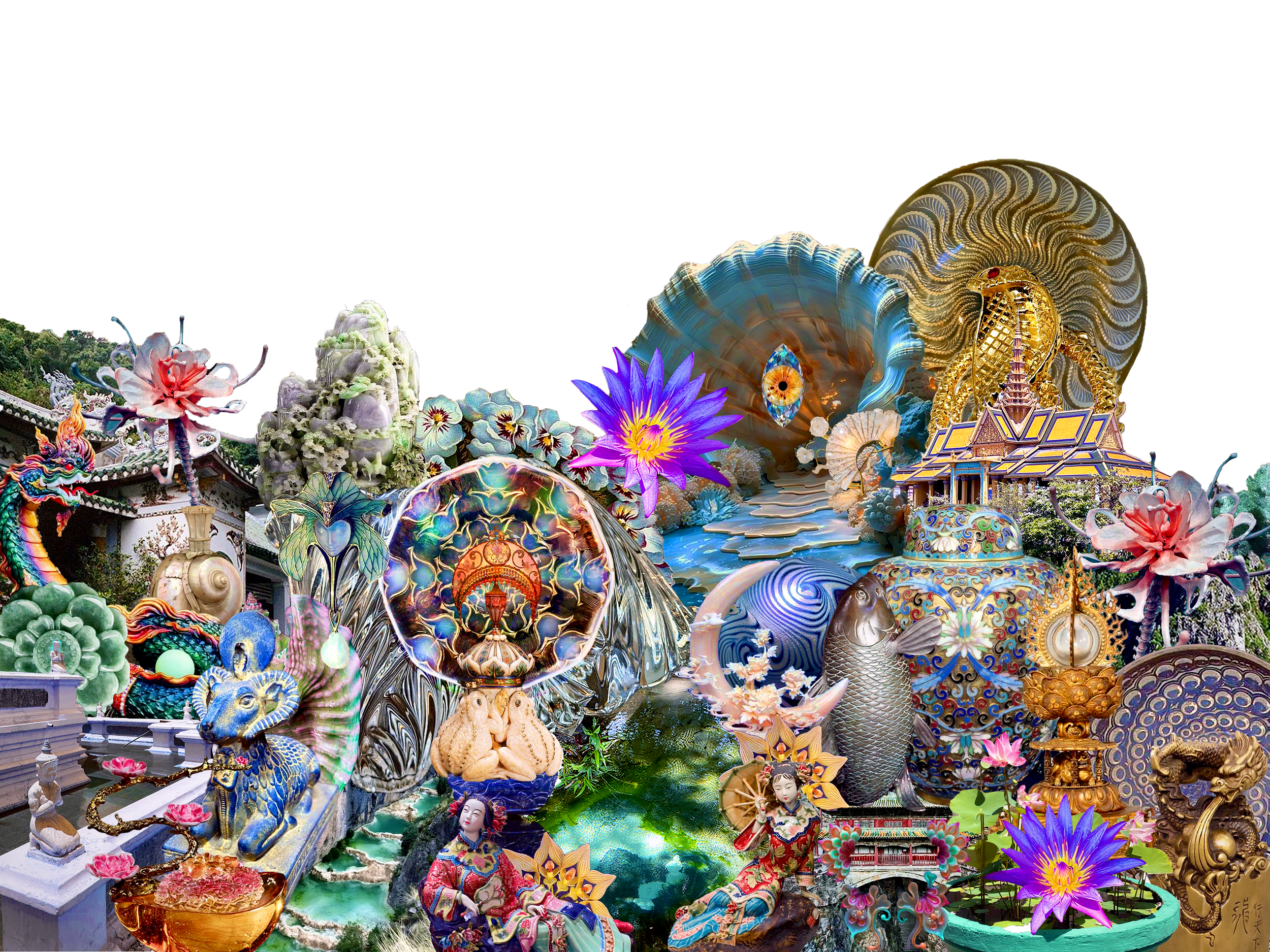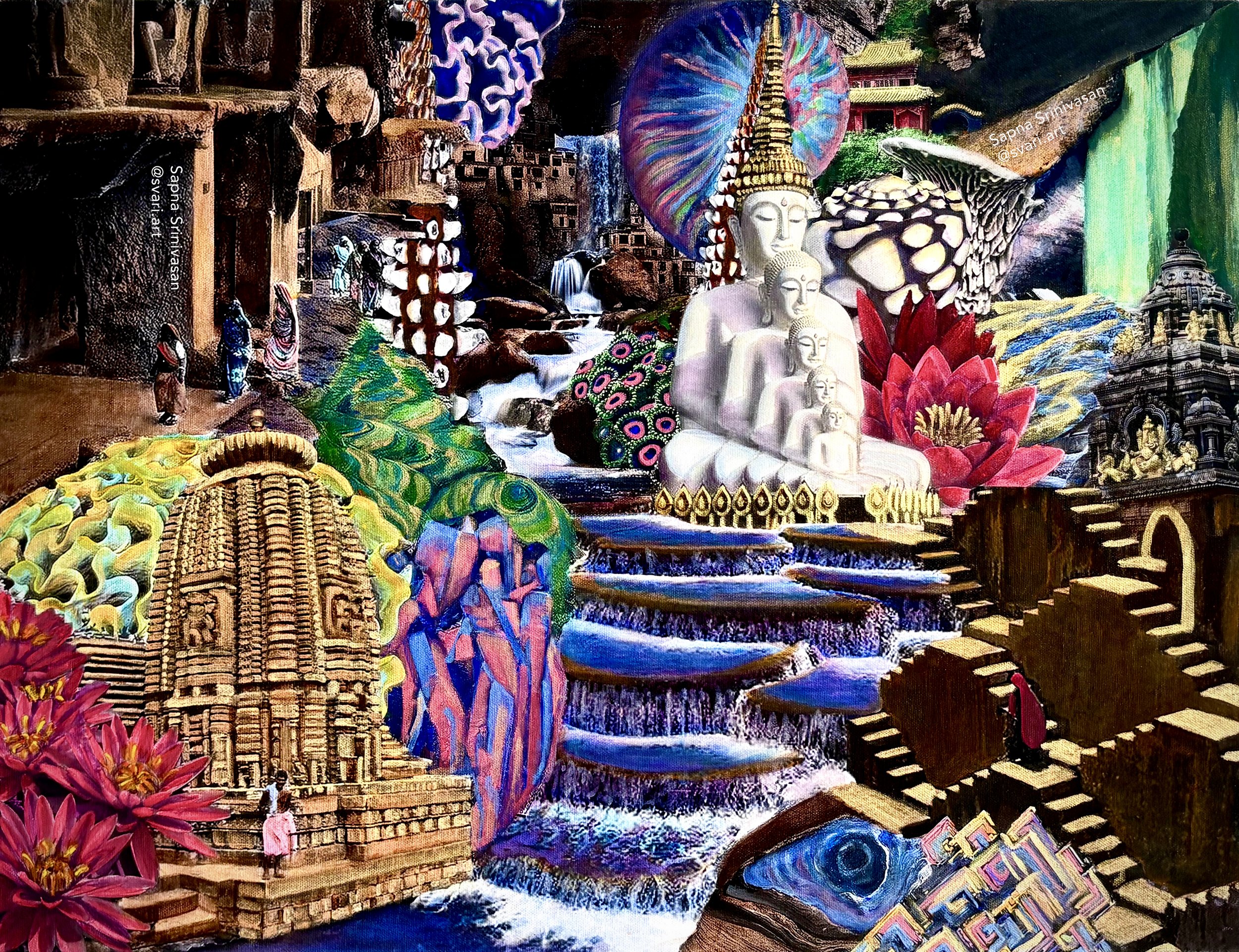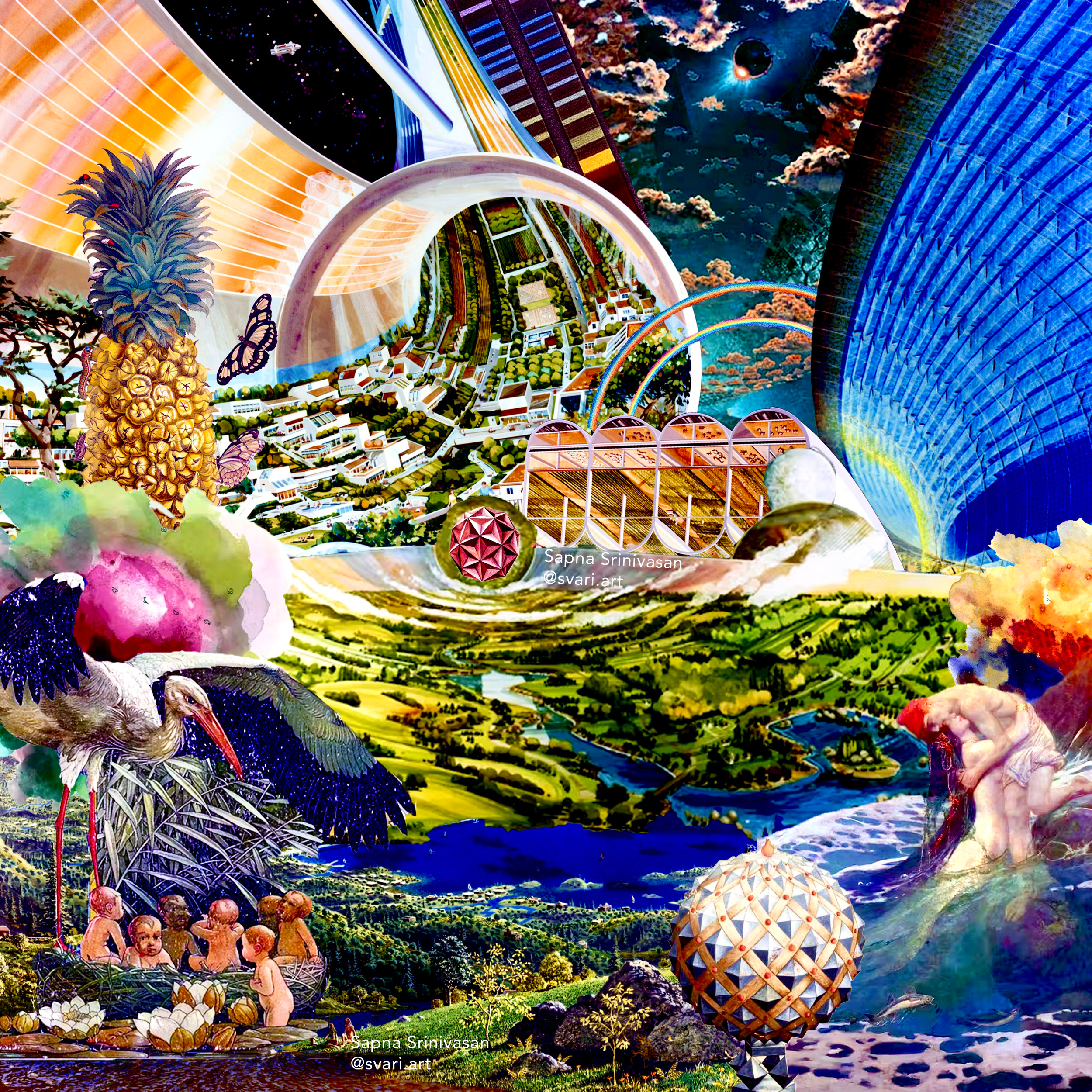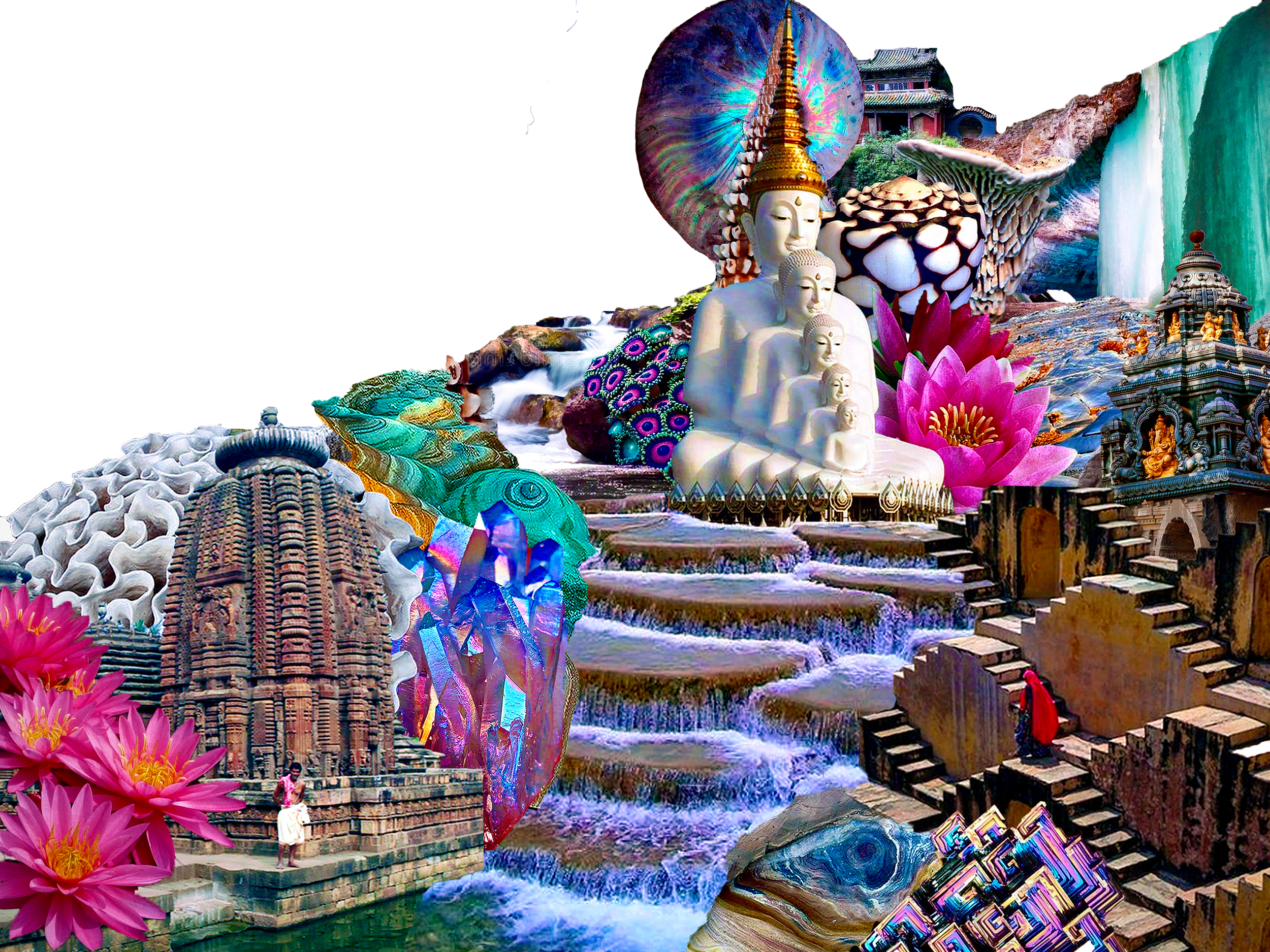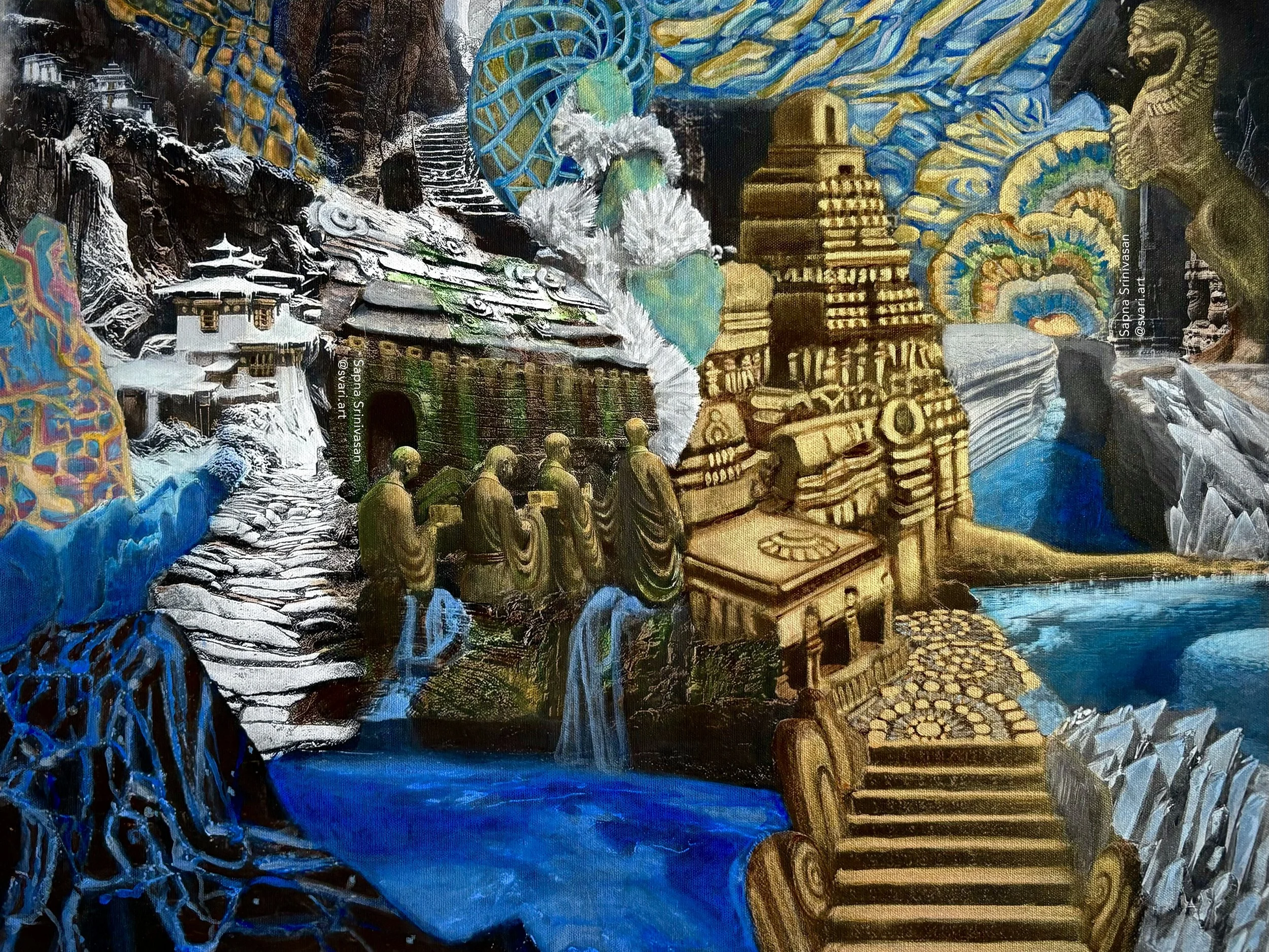 My process moves fluidly between digital and physical mediums, allowing me to create otherworldly, immersive landscapes. I begin by gathering photographs I’ve taken alongside images that resonate intuitively, digitally cutting and layering them to form the foundation of a collage. Rather than working toward a fixed outcome, I allow intuition to guide the composition — assembling fragments much like a puzzle, open to discovery as it unfolds.